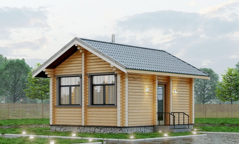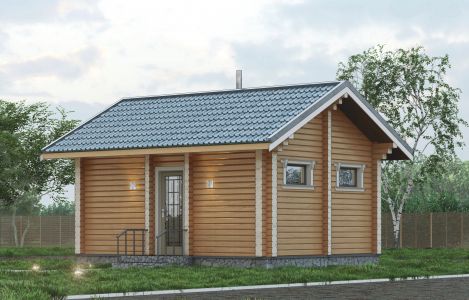 Баня из профилированного бруса с традиционной архитектурой и двускатной формой крыши. Вход в баню выполнен через открытую террасу — необходимость в отдельно-стоящей беседке попросту отпадает! В планировке предусмотрено все самое необходимое — комната отдыха, парная и мойка.