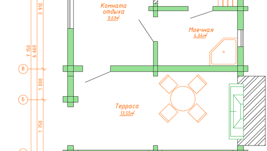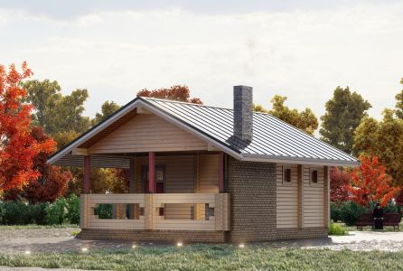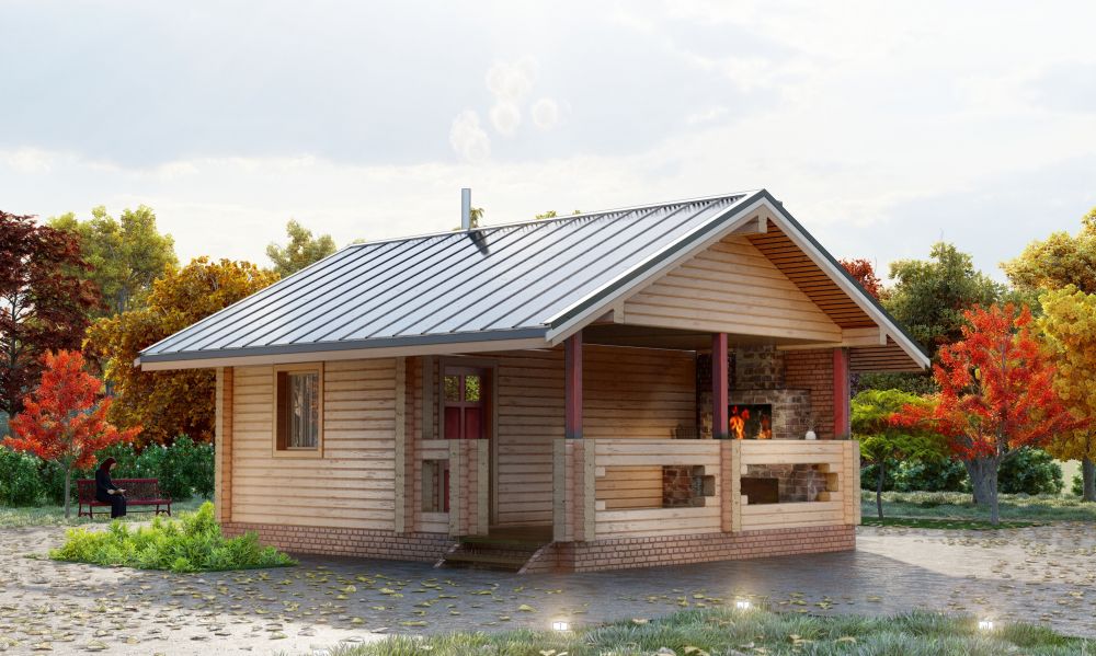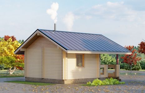 Баня из профилированного бруса с комнатой отдыха, парной и мойкой. Проектом также предусмотрено размещение зоны барбекю на террасе. Архитектурно баня близка к стилю «Шале», который включает в себя большие свесы кровли, видимые балки и консоли, поэтому идеально впишется в горную местность рядом с домом-шале.